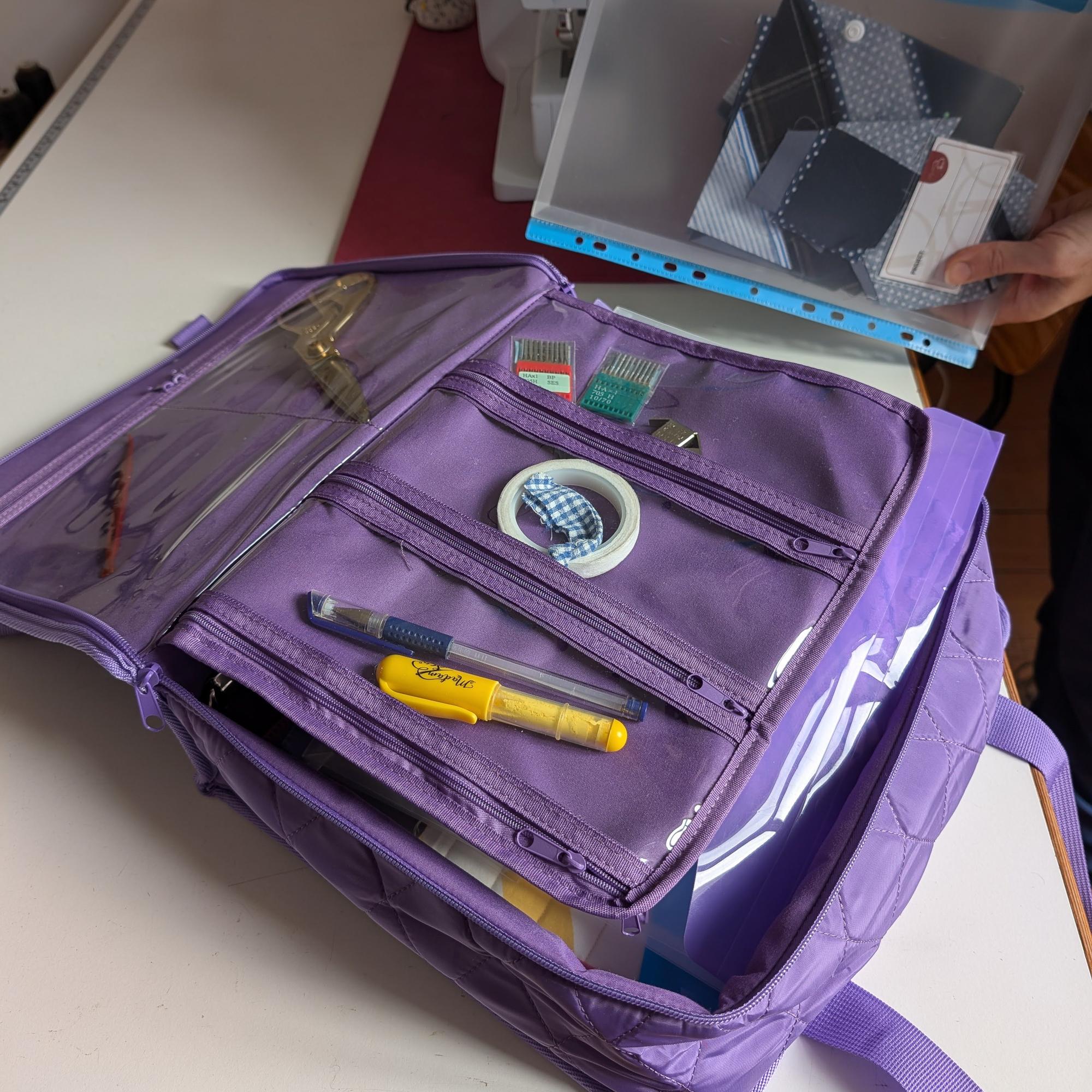 Love this bag and the idea of making room for BINDER ENVELOPES to store projects in, with labels included. I can fit 5 cross stitch projects with hooped cloth, all my necessary notions and threads. This is the best one for me and I think others will love it too! Very convenient and is compact enough to tuck in the car, trunk or stow away in the sewing room.