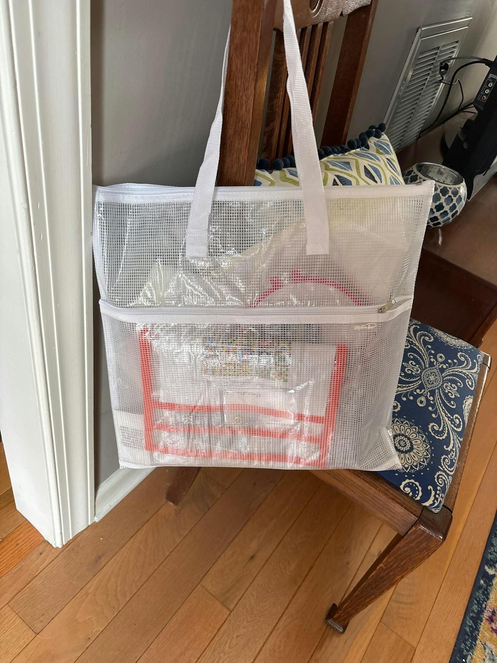 If you need to clean your bag, you can dust out the inside. And if necessary, use a damp or soapy cloth to clean the plastic…just make sure to dry the bag thoroughly before putting it away or using it again.